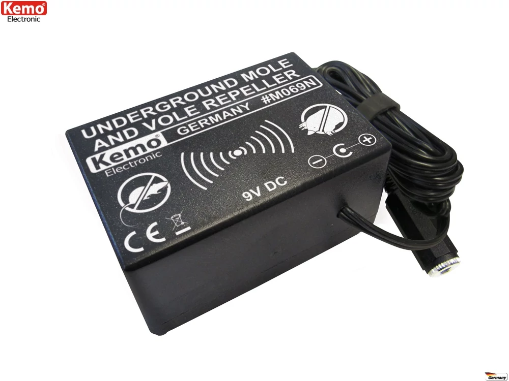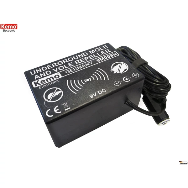 Professzionális újdonság a KEMO-tól. Időjárás és vízálló vakond, rágcsáló és pocokriasztó, ami lüktető és agresszív szeizmikus rezgéseket kelt, melyek a talajban szétterjednek, és ezeket a vakond és a legtöbb rágcsáló elkerüli. A hatótáv 1000m2, a legtöbb kertben ennek megfelelően csupán egy ilyen készülék is elég. A modult 10-30 cm mélységre kell beásni a talajba a járatok közelébe, és kábelen keresztül 9V DC feszültséggel megtáplálni. A tápegység ( hagyományos stabilizált 9V DC tápegység) nem tartozéka, külön rendelhető.